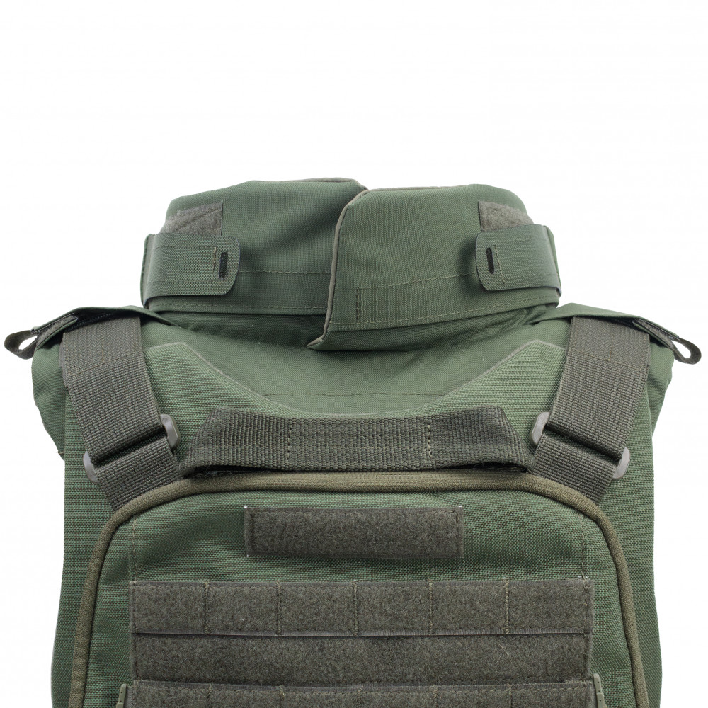 Для установки изделия требуется снять стандартные плечевые накладки комплекта HARD DEFENSE. После установки формируется расширенная зона противоосколочной защиты, объединяя шейный ворот и  плечевые накладки в единый защитный контур.