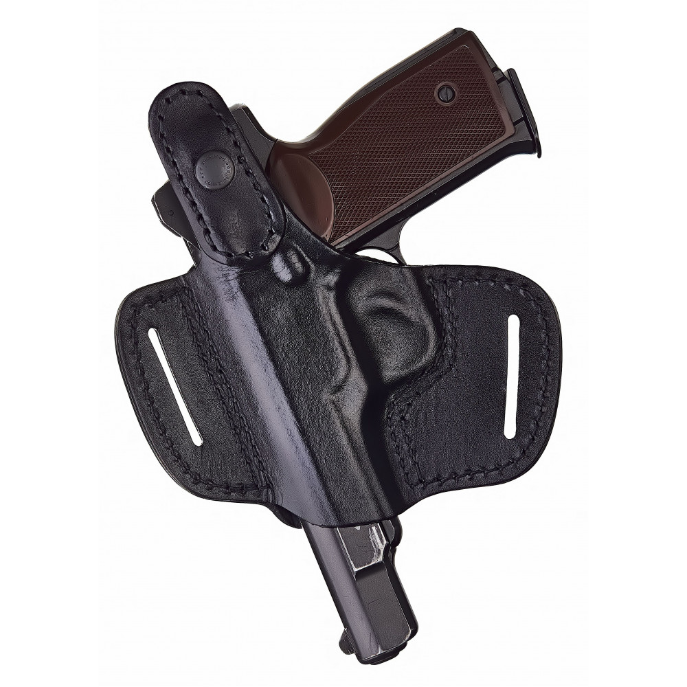 Конструкция кобуры обеспечивает плотное удержание пистолета, но на ряду с этим кобура оснащена дополнительным страховочным хлястиком, который отстегивается движением вниз и влево большим пальцем правой руки.